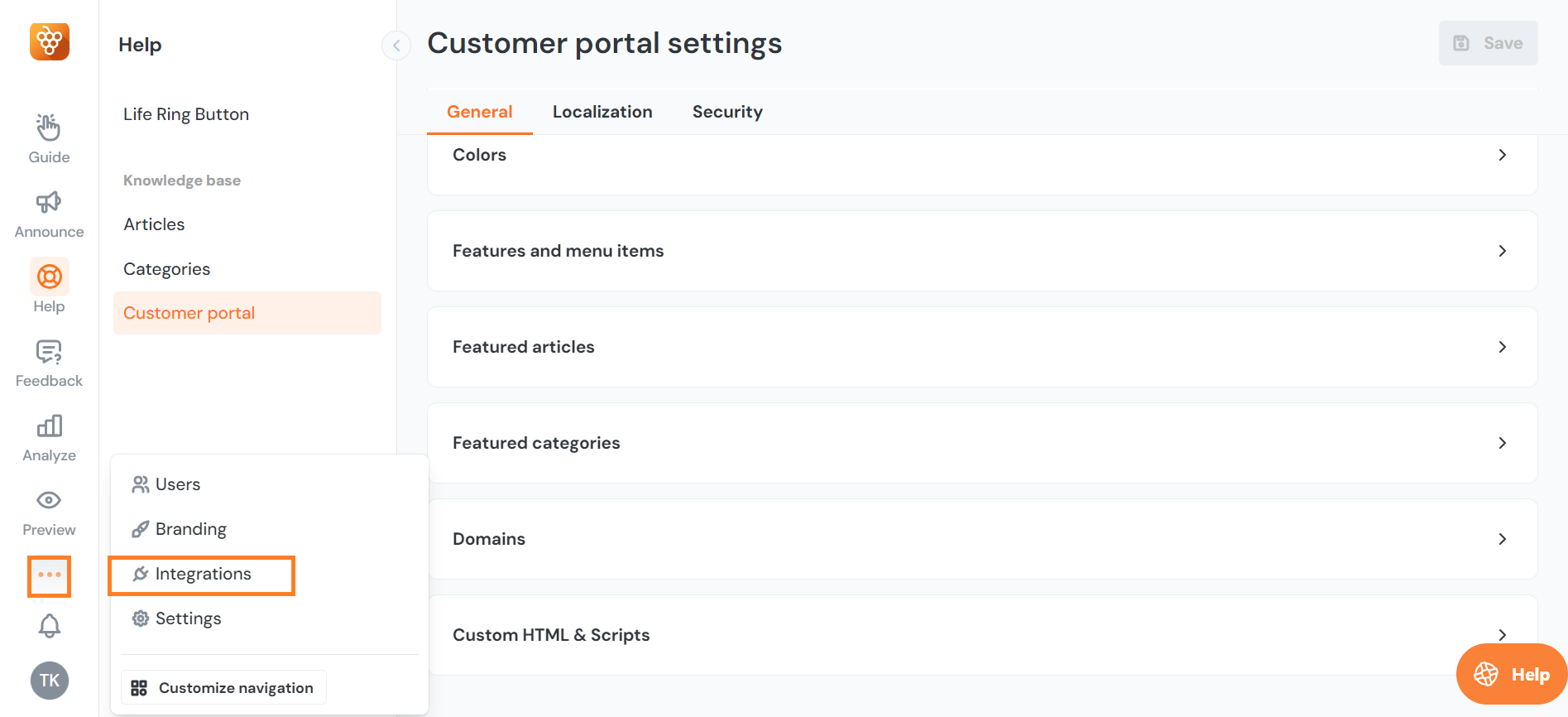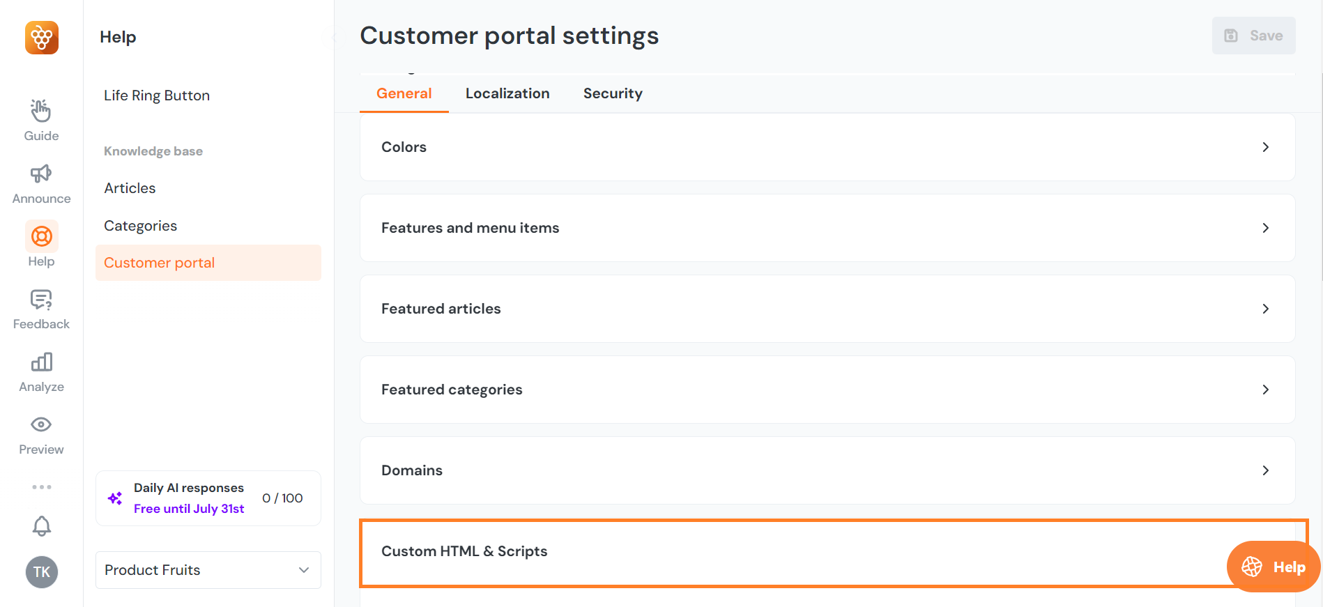 Navigate to Help > Customer portal to access the settings, then under General tab scroll down to the bottom of the page, and open the Custom HTML & Scripts toggle. Here we will work in the Body HTML or script tags box.